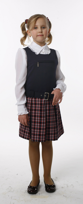 Юбка сарафана из ткани в клетку с тремя встречными складками впереди и сзади. Пояс съёмный с застёжкой на пряжку.